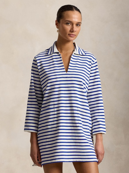 Blue Heavy Cotton Jersey Striped Tunic Dress With Polo Written Logo