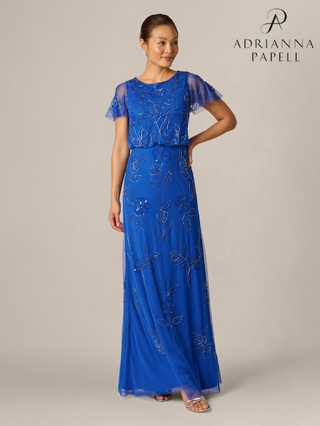 Adrianna Papell Blue Studio Bead Mesh Long Dress