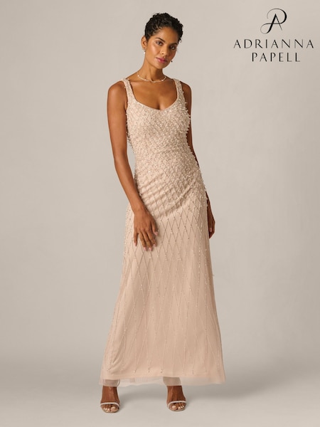 Adrianna Papell Pink Bead Mesh Long Dress
