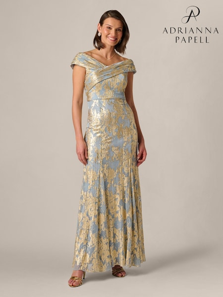 Adrianna Papell Blue Foil Leaf Mermaid Gown