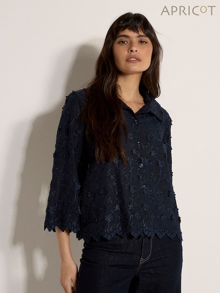 Apricot White 3D Floral Print Embroidered Crop Shirt