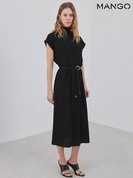 Mango Black Turtle Neck Belted Midi Dress