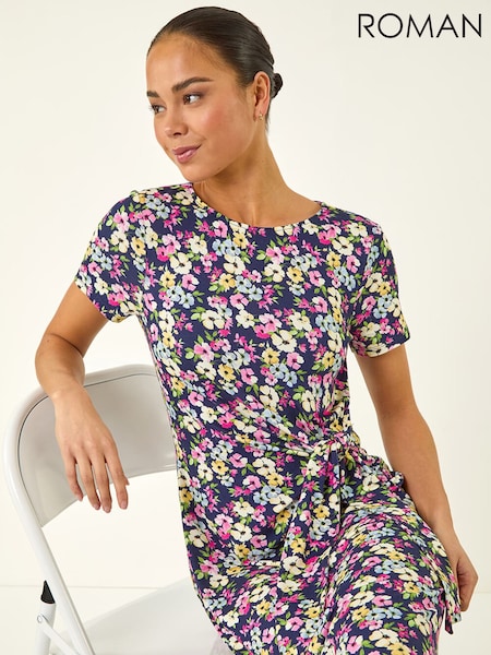 Roman Blue Petite Floral Side Tie Midi Dress