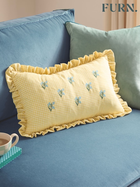 Furn Yellow Les Petite Fleurs Gingham Ruffle Feather Filled Cushion
