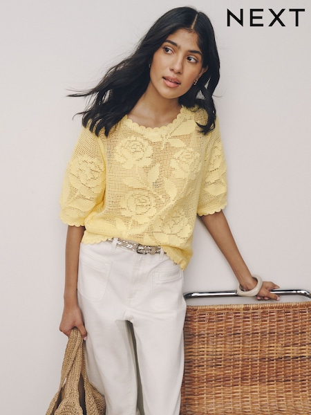 Light Yellow Floral Crochet Short Sleeve Crew Neck T-Shirt