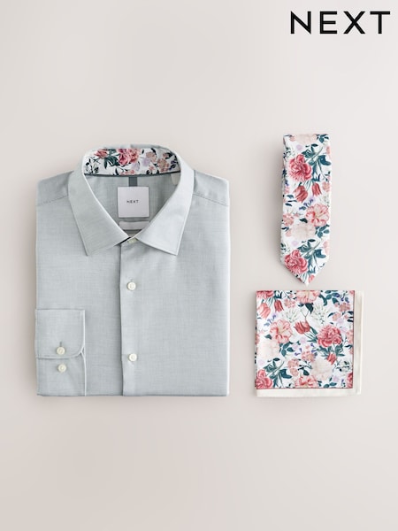 Seafoam Green/ Pink Floral Slim Fit 100% Cotton Shirt, Tie, Pocket Square and Pin Kew Garden Occasion Set