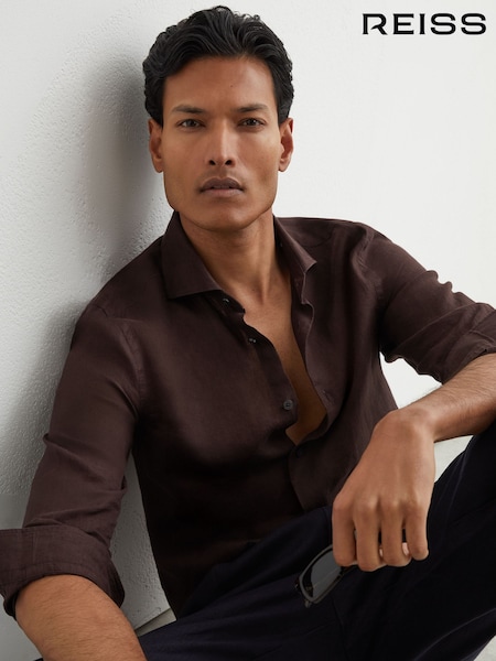 Reiss Chocolate Brown Ruban Linen Cutaway-Collar Regular-Fit Shirt