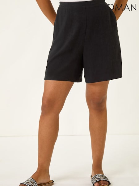 Roman Black Petite Linen Mix Elastic Waist Shorts