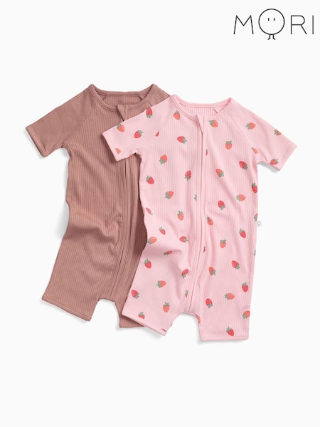 MORI Pink Strawberry Fields Supersoft Ribbed Summer Zip-Up Romper 2 Pack