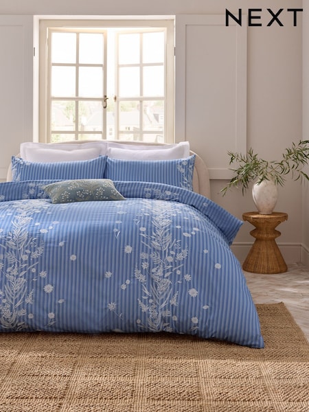 Blue 200TC Embroidered Stripe Floral Duvet Cover and Pillowcase Set