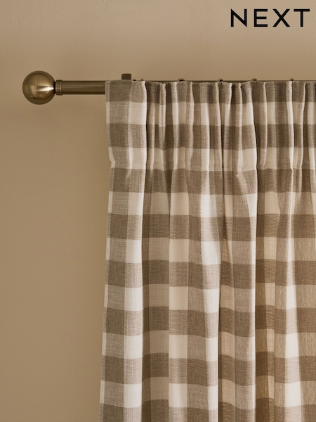 Natural Woven Gingham Check Pencil Pleat Lined Curtains
