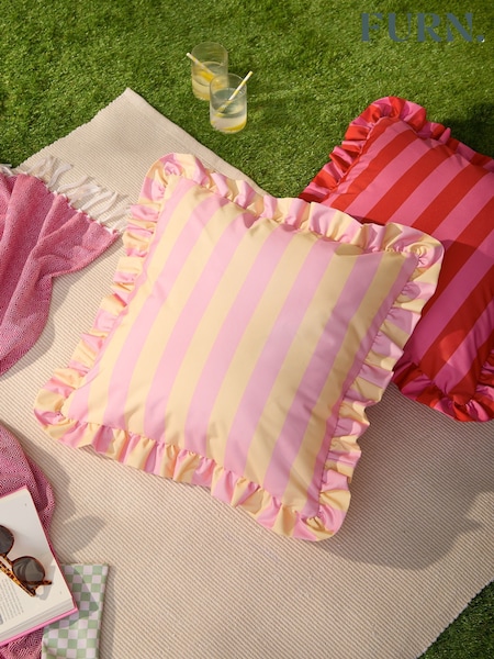 Furn Pink and Green Palm Royale Stripe Ruffle Outdoor Cushion