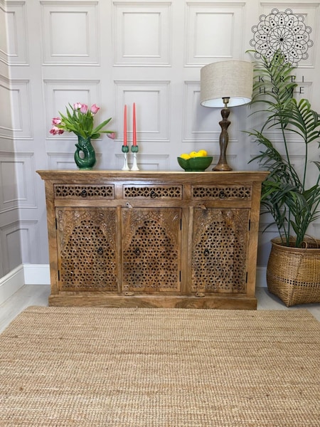 (59)Perfect for the dining room, our mango wood sideboards are a classic addition. Combining on-trend elements with a vintage a charm, bring home a large or a standard sideboard from our Amsterdam and Elmir collection. Stow your cutlery, tableware and dinnerware in these spacious sideboards that are also available in display cabinet designs, while completing the look is easy with pretty vases, lamps and photo frames on its top.