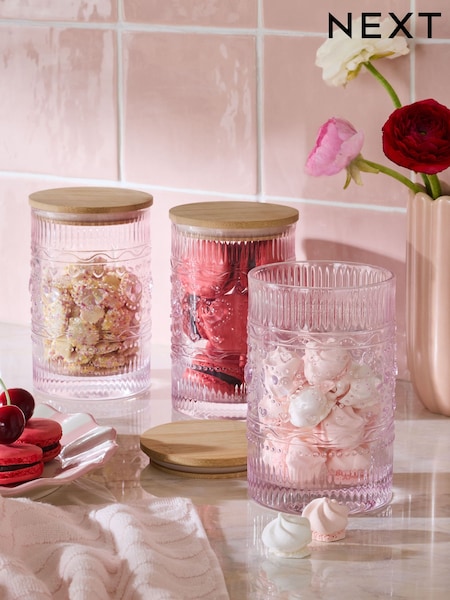 Set of 3 Pink Lisse Floral Glass Storage Jars