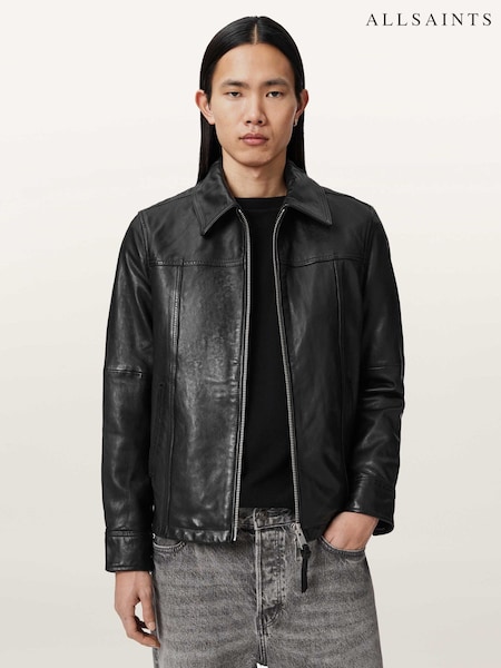 AllSaints Black Alkan Black Collared Zip Up Two Tone Leather Jacket