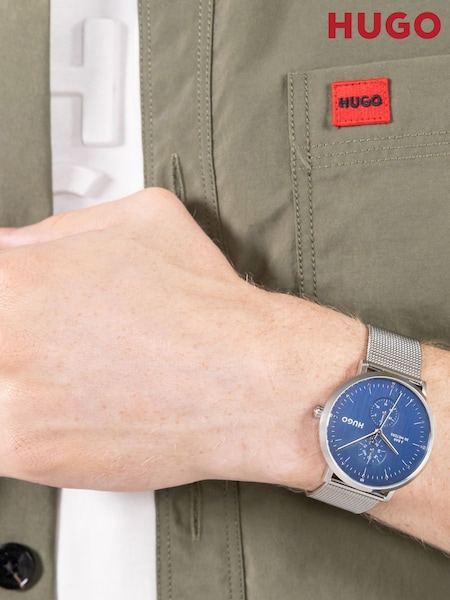 HUGO Silver Tone Style Stainless Steel Mesh Bracelet And Blue Dial Watch
