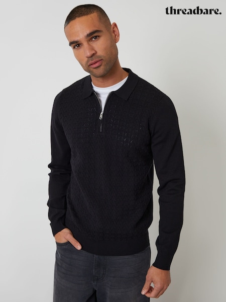Threadbare Black Textured Knit Quarter Zip Polo Jumper