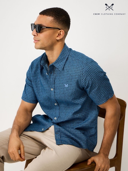 Crew Clothing Blue Short Sleeve Geo Printed Linen Blend Shirt