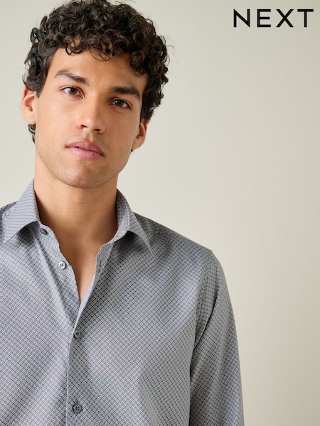 Petrol Blue Geometric Print Regular Fit Cotton Rich Long Sleeve Formal Shirt
