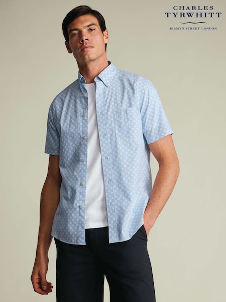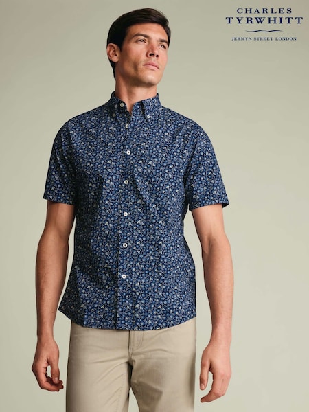 Charles Tyrwhitt Blue Shorts Sleeve Printed Stretch Washed Poplin Shirt