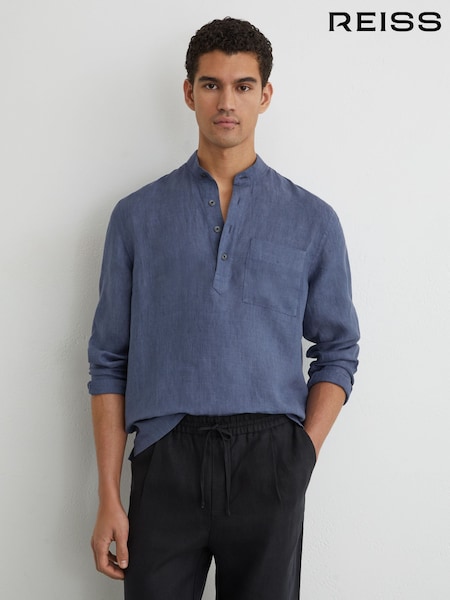 Reiss Denim Blue Trident Linen Grandad-Collar Half-Button Shirt Regular-Fit