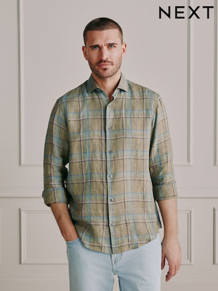 Green/Pink Check Regular Fit Signature Linen Long Sleeve Smart Shirt