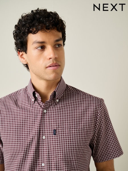 Burgundy Red Mini Check Regular Fit Easy Iron Button Down Short Sleeve Oxford Shirt