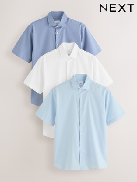 Blue/White Cotton Linen Blend Short Sleeve Smart Shirts 3 Pack