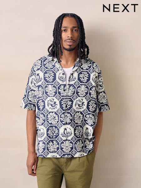 Navy Bird Jaquard Print Short Sleeve Shirt