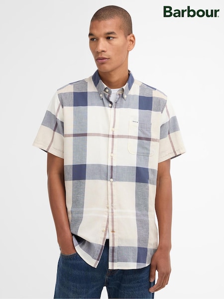 Cream/Blue Tattersall Check Regular Fit Easy Iron Button Down Short Sleeve Oxford Shirt