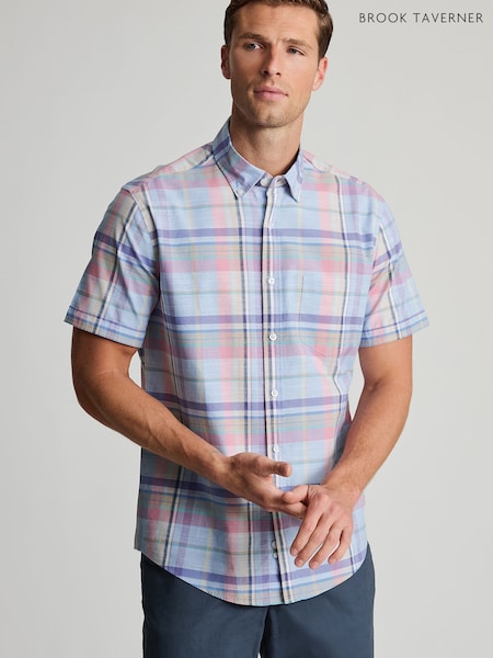 Brook Taverner Sky Blue Check Slub Cotton Short Sleeve Shirt