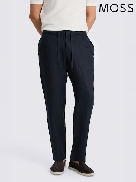 Navy Regular Tapered Fit Signature 100% Linen Trousers With Elasticated Waist