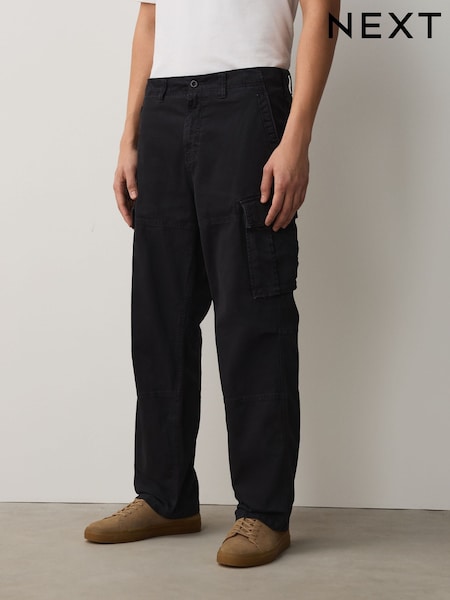 Black Relaxed Fit Authentic Washed Cotton Rich Cargo Trousers With Stretch