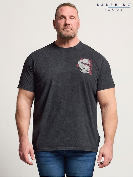 BadRhino Big & Tall Grey Acid Wash Dragon Print T-Shirt