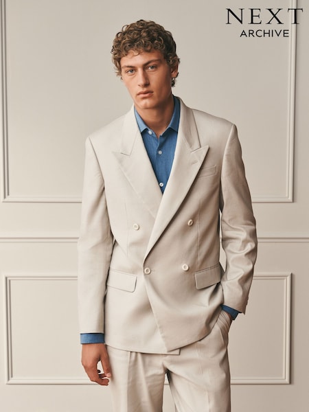 Light Grey Regular Fit Textured Linen Blend Double Breasted Blazer