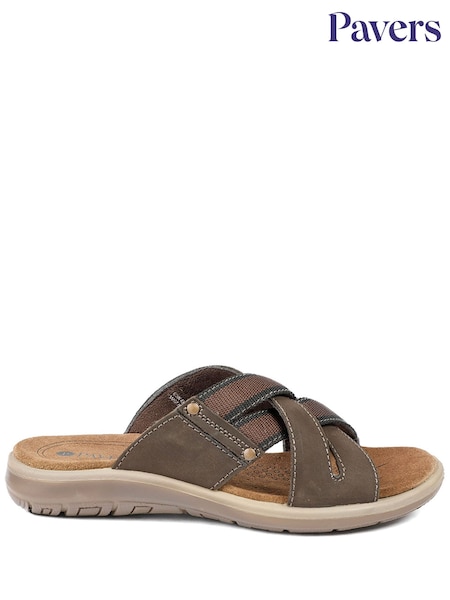 Pavers Brown Leather Cross Strap Slip On Sandals