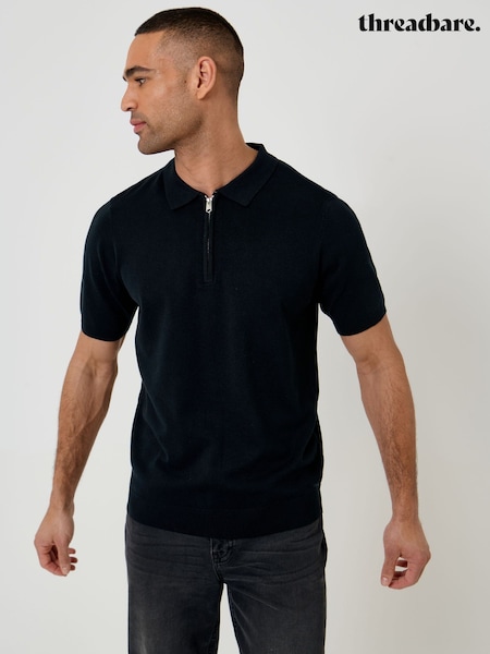 Threadbare Black Quarter Zip Knitted Polo Shirt