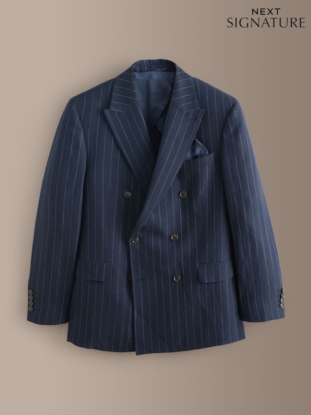 Navy Tailored Fit Double Breasted Signature Leomaster Italian Wool Linen Stripe Suit Jacket