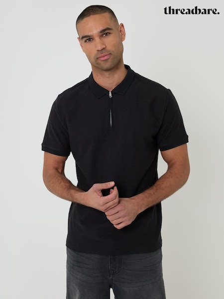 Threadbare Black Textured Quarter Zip Polo Shirt