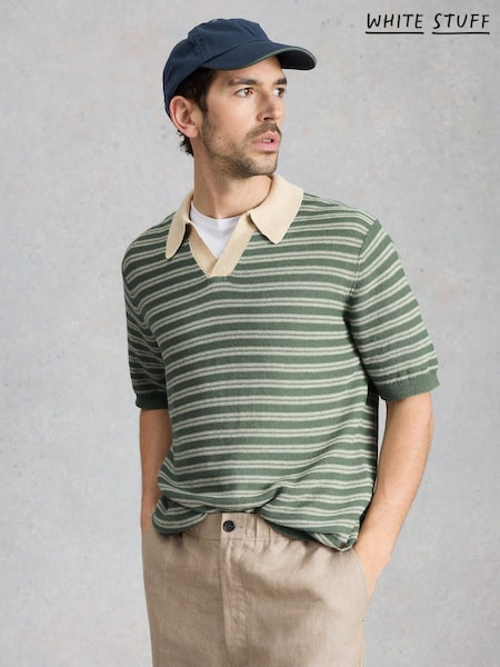 White Stuff Green Thame Linen Blend Knitted Polo Shirt