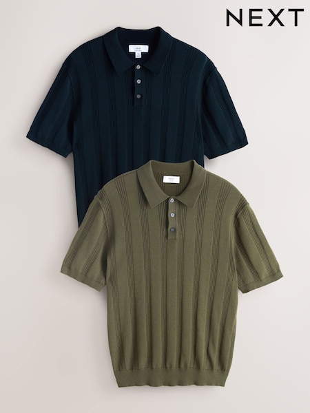 Navy Blue/Green Regular Fit Cotton Rich Pointelle Stripe Short Sleeve Knit Polo Shirts 2 Pack