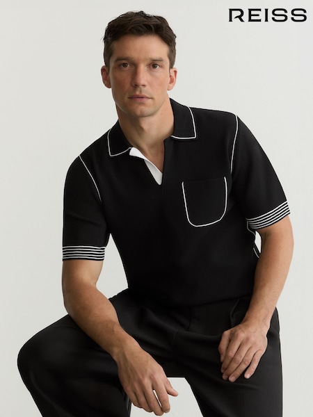 Reiss Black Newbury Contrast-Stitch Knitted Polo Shirt