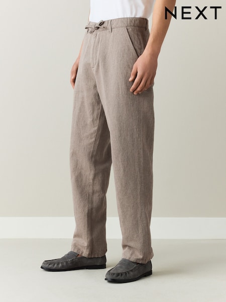Mushroom Brown Straight Fit Cotton Linen Blend Twill Chino Trousers