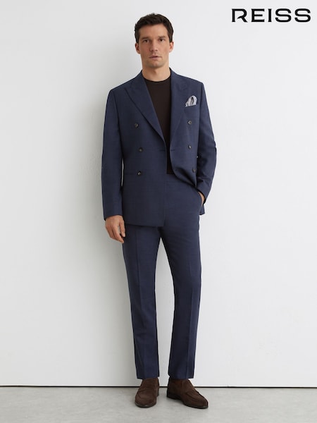 Reiss Airforce Blue Fibre Side Adjuster Wool Textured Tailored-Fit Trousers