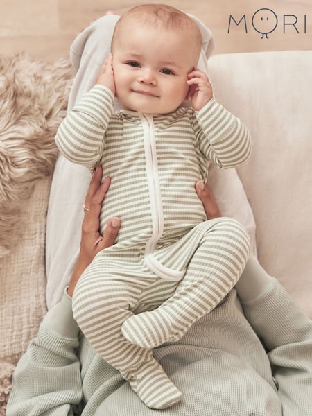 MORI Green Supersoft Ribbed Stripe Two Way Zip-Up Sleepsuit
