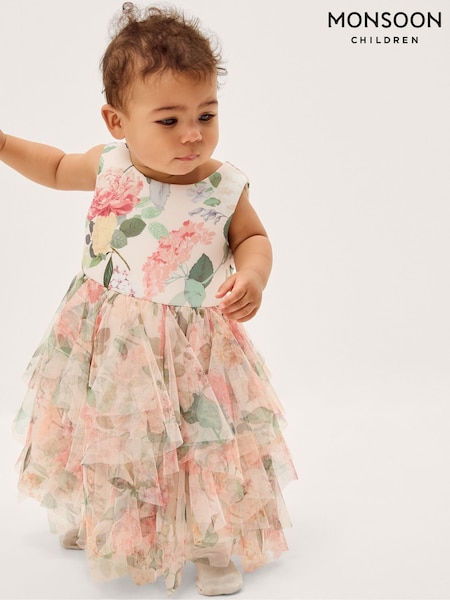 Monsoon Pink Baby Agnes Floral Print Ruffle Tier Dress