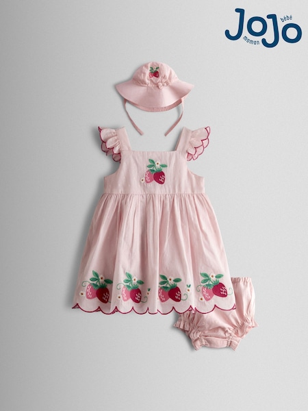 JoJo Maman Bébé Pink Strawberry Embroidered Dress & Hat Set