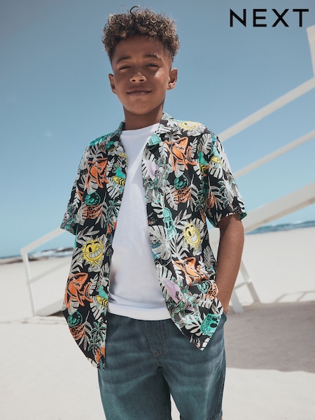 Black Palm Embroidery Short Sleeve Revere Collar Shirt (3-16yrs)