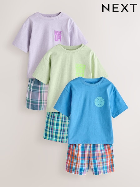 Blue/Green/Purple Check Woven Short Pyjamas 3 Pack (9mths-12yrs)