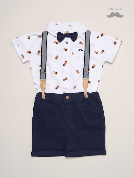 Little Gent Blue Mock Shirt Bear Print Bodysuit Bowtie And Shorts With Braces Outfit Set